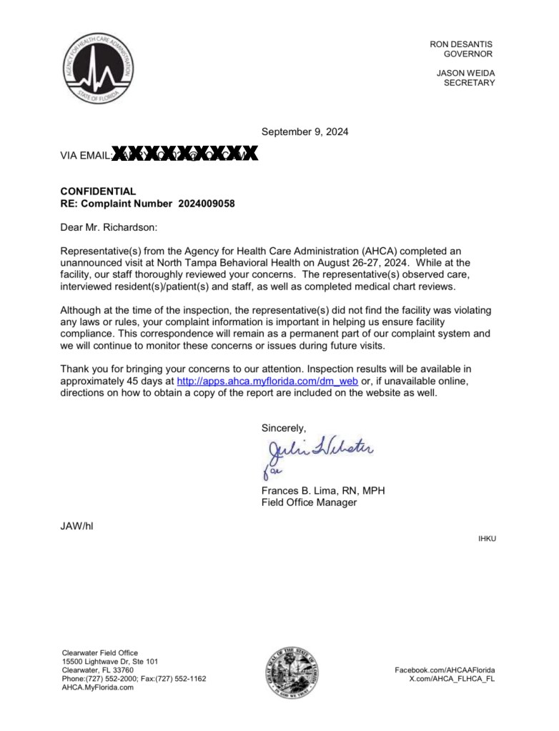 October 23, 2024: View the letter in which the Florida Agency for Healthcare Administration finds no problems at the North Tampa Bay Behavioral Clinic